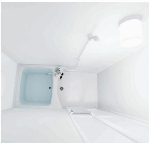 (基本仕様)壁柄:プレーンホワイト(ラミリア)、床色:ミディアムグレー、筒形照明 1灯、デッキ2ハンドル水栓(ホワイト・一般地・吐水パイプL240)