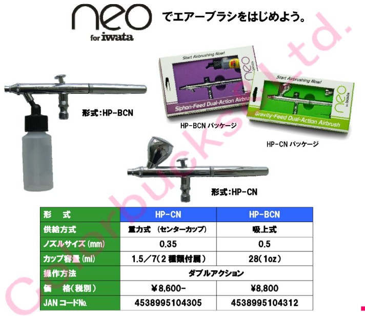 | NEO エアーブラシシリーズ | | 型式 | HP-CN | HP-BCN | | 供給方式 | 重力式(センターカップ) | 吸上式 | | ノズルサイズ(mm) | 0.35mm | 0.5mm | | カップ容量(ml) | 1.5ml / 7ml (2種類付属) | 28ml (1oz) | | 操作方法 | ダブルアクション | |