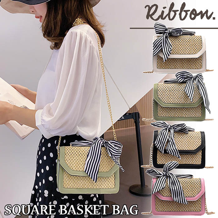 ★リボンが可愛い★かごバッグ ショルダー ポシェット ストローバッグ ショルダーバッグ クラッチ 斜めがけ 斜め掛け 小さめ ちびバッグ ミニバッグ スクエア