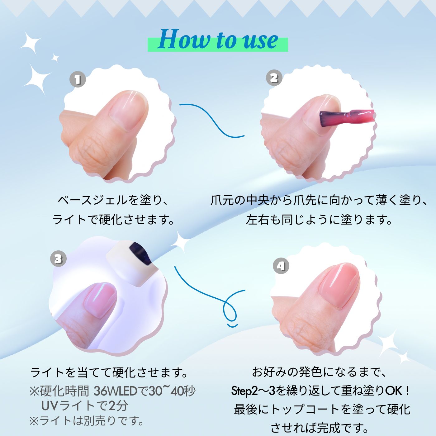※必ず化粧品登録済みのベースジェルの上からご使用ください。
