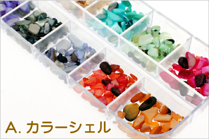 A.のカラーシェルは、少し厚めに砕いた貝殻の角を丸く加工し、着色しました。自然なパールの輝きと貝の模様のグラデーションがユニークです。