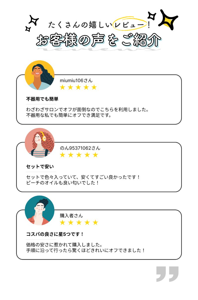 ネイルサロンで施術したジェルネイルも、セルフネイルも、全部自分で簡単に落とせます。