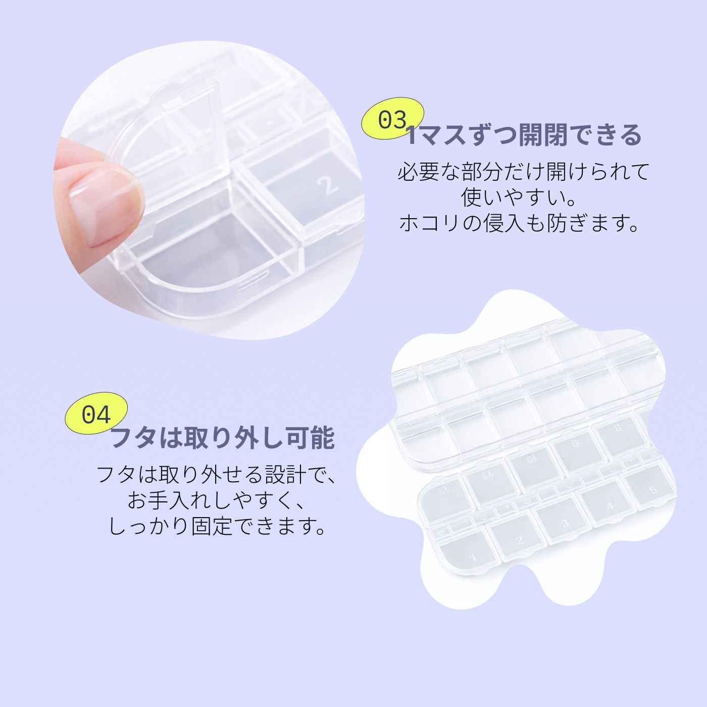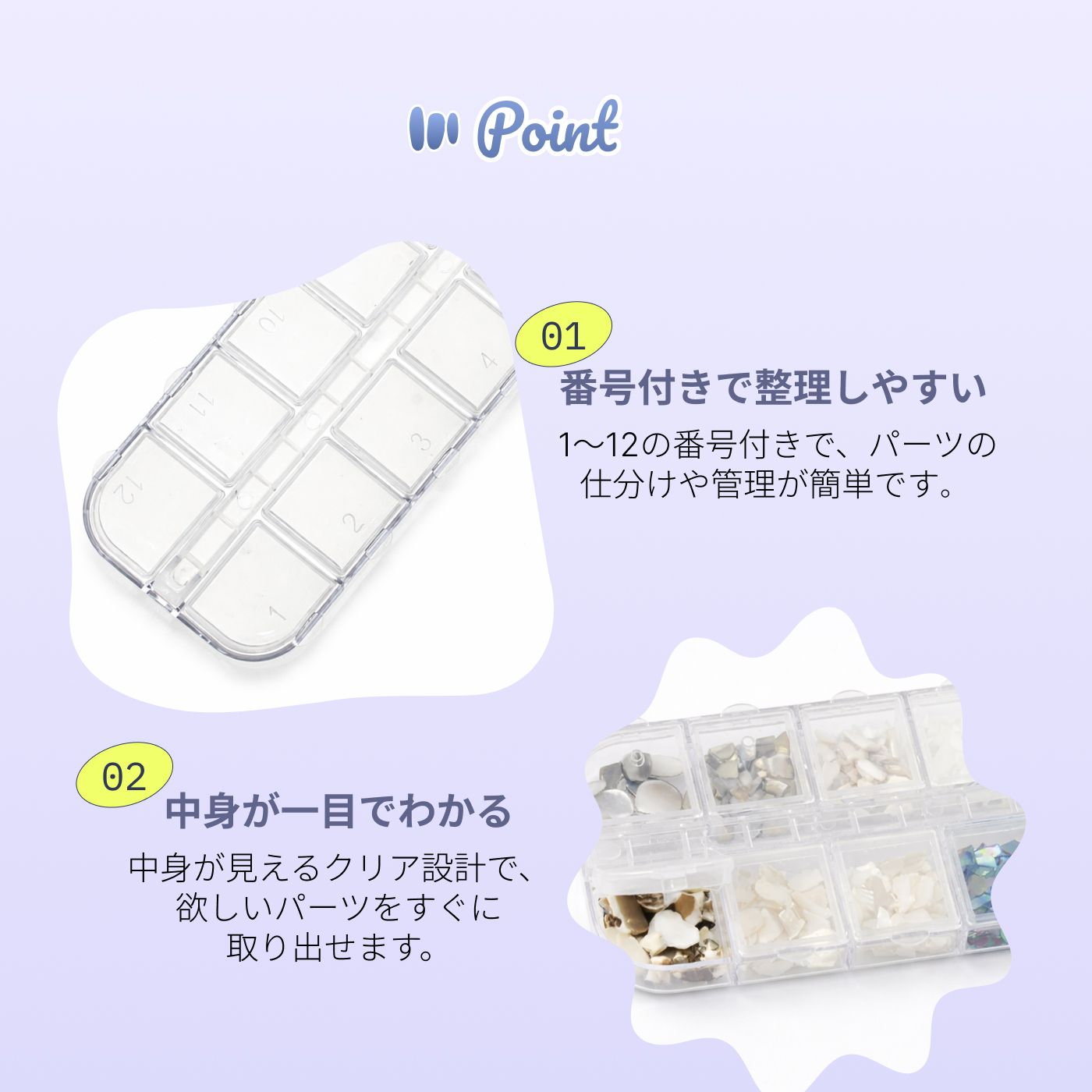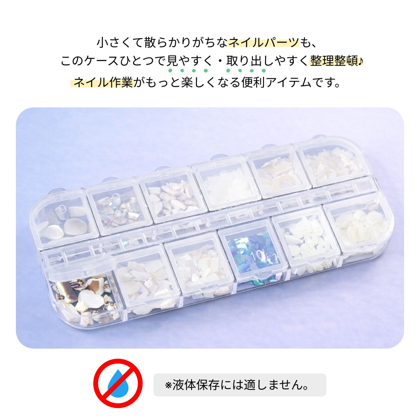 ネイル用品はもちろん、レジンパーツ・アクセサリーパーツ・ピルケース・ビーズ収納などにも。
