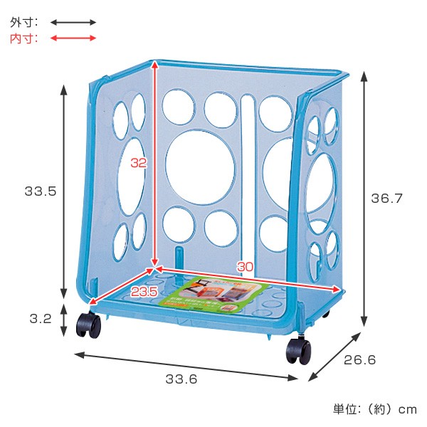 スタッキングできるキャスター付きの新聞紙ストッカーです。雑誌や、新聞をストック出来ます。上に積み重ねてスタッキングして使用することもできます。ストックして重たくなってきても安心、キャスター付きなので楽に移動ができます。ヒモ掛けが付いているのであらかじめヒモを通しておくことで、束ねやすい構造になっていて手間がかかりません。お掃除をする時も、キャスターが付いていて簡単に移動ができるので楽ちんです。テーブル下や、サイドに置いてマガジンラックにしてもお使いいただけます。【商品詳細】 サイズ/約幅33.6×奥行26.6×高さ33.5(キャスター取付時高さ36.7)cm 重量/約855g 内容量/1個 材質/ポリプロピレン カラー/クリアブルー 生産国/日本製 備考/スタッキング可能《ストッカー 新聞紙ストッカー ラック 新聞紙 マガジン 雑誌 収納ボックス スタッキング 積み重ね 整理ボックス 整理 片付け 雑誌ラック マガジンラック マガジンストッカー 便利グッズ 便利 整理整頓 シンプル 使いやすい ブルー 水色 青色》