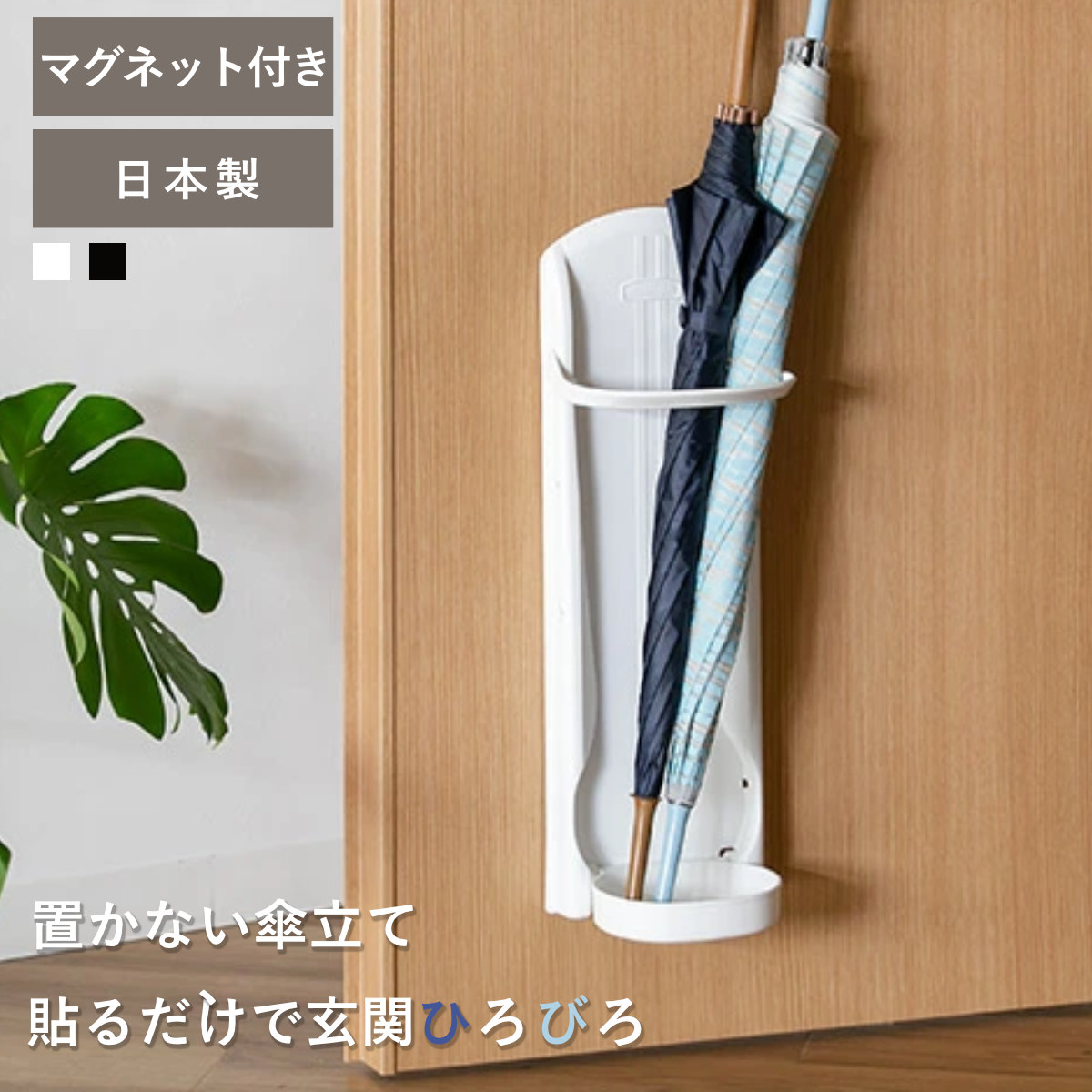 ドアに磁石でくっつけるタイプの傘立てです。ドアが収納スペースになるので、玄関を広く、無駄なく活用できます。立てかけている傘が倒れたり、玄関を掃除する際に傘立てをいちいち動かしたり等、面倒なひと手間から開放されます。