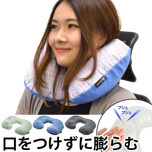 | 口を付けずに膨らむポンプ式 口をつけずにポンプで膨らませるので衛生的です。首に付けたまま柔らかさを調節しながら膨らませられます。 | 使い勝手抜群 裏地は肌触りの良いパイル地を使用し快適にお使いいただけます。空気を抜きやすい逆止弁なしの空気栓を採用しています。 |
