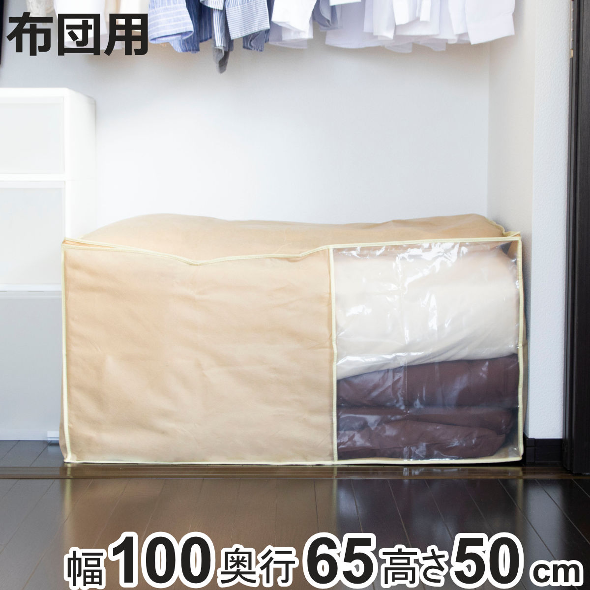 奥行は65cmでクローゼットや押入れの中に収納できるサイズです。座布団や衣類用など豊富なサイズ展開があり、複数揃えて収納すると見た目もスッキリ整います。