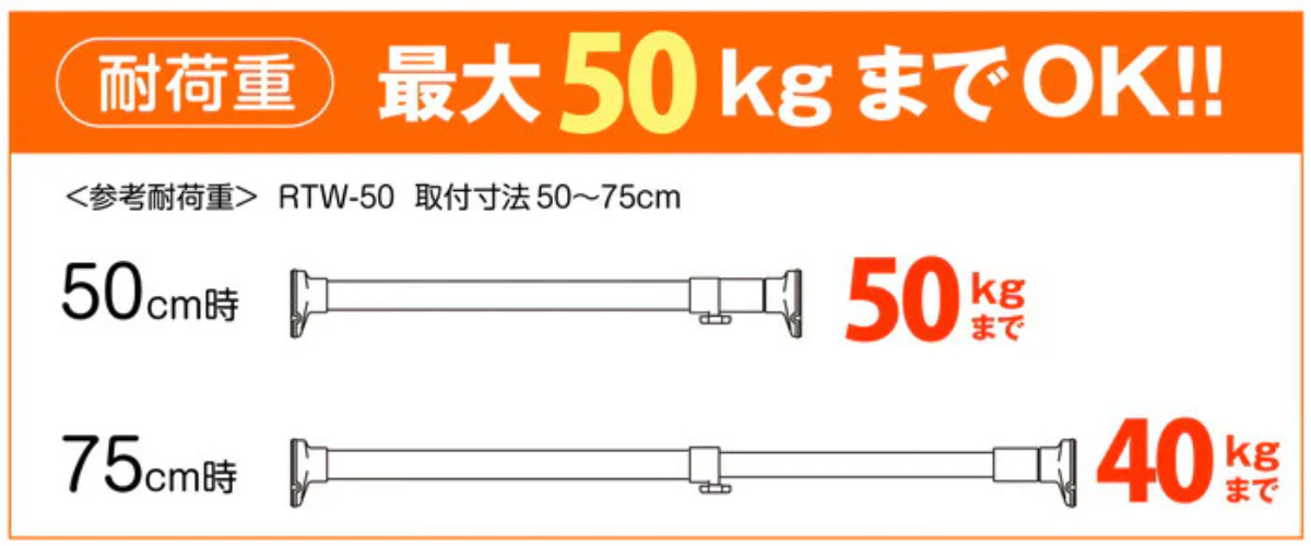 | 注意事項 | ※石膏ボード、砂壁、内部に空洞のある壁などには取付けないでください。 ※壁の距離、壁の状態、つっぱり方により耐荷重は変化します。 |