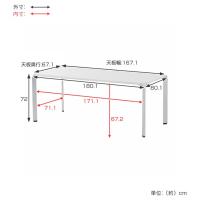| サイズ | 本体:約 幅180.1(天板幅167.1)×奥行80.1(天板奥行67.1)×高さ72(cm) 足元空間:約 幅171.1×奥行71.1×高さ67.2(cm) 天板角切り欠き部分:6.5×6.5(cm) |
