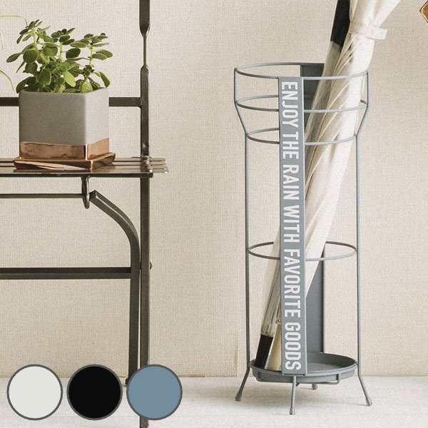 円を組み合わせたようなワイヤーが印象的なアンブレラスタンドです。 「お気に入りのアイテムで雨を楽しむ」と書かれており、シンプルでスタイリッシュな空間を演出します。デザインと機能性を兼ね備えており、落ち着いた色合いが玄関をスタイリッシュに演出してくれます。