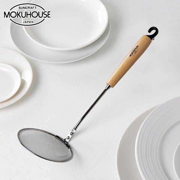 自然木の持ち手が魅力の日本製キッチンツール●自然木ならではのやさしい感触が心地よい、木製ハンドルのかす揚げです。