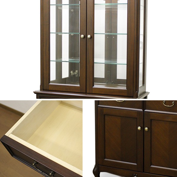 | 備考 | 組立品:大人2人で約10分 付属品:可動棚板(ガラス板3枚、木製板1枚) 引き出し:ゴムストッパー付き ※写真と商品は色合いが多少異なる場合がございます。予めご了承下さい。 |