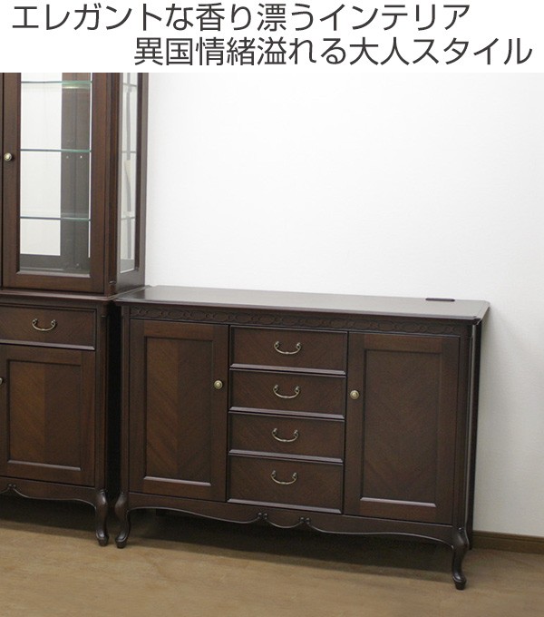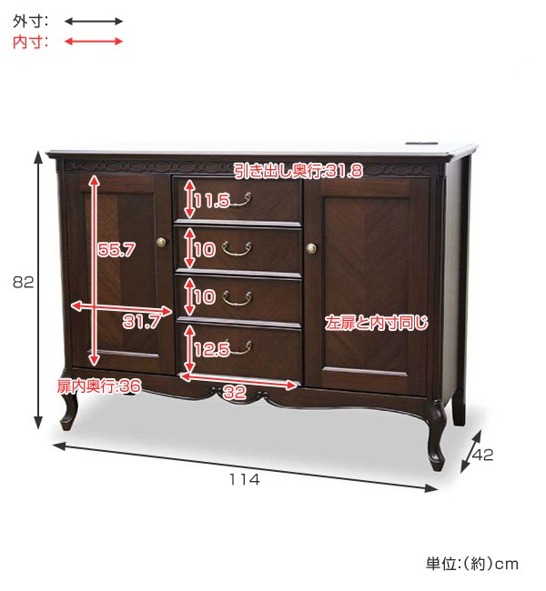 | 材質 | 【ホワイト】 主材:マホガニー(脚部)、リンデン、MDF 突板:リンデン 【ダークブラウン】 主材:マホガニー、MDF 突板:マホガニー 天板、前板模様貼り仕様 【共通】 塗装:ポリウレタン塗装 背面処理:塗装仕上げ |