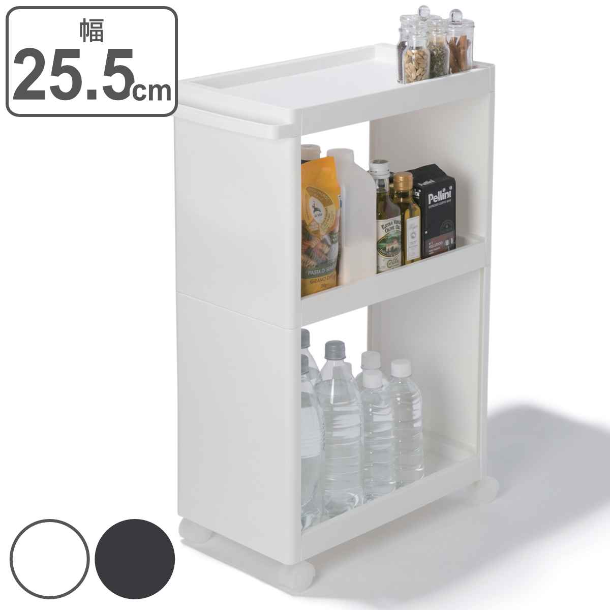 幅26cmのすき間を収納スペースにキッチンやランドリーのちょっとした隙間を有効活用できるスリムワゴンです。キッチンでは食料品や調味料、水など、ランドリーでは雑貨類、洗剤などのストックがすっきり収納できます。