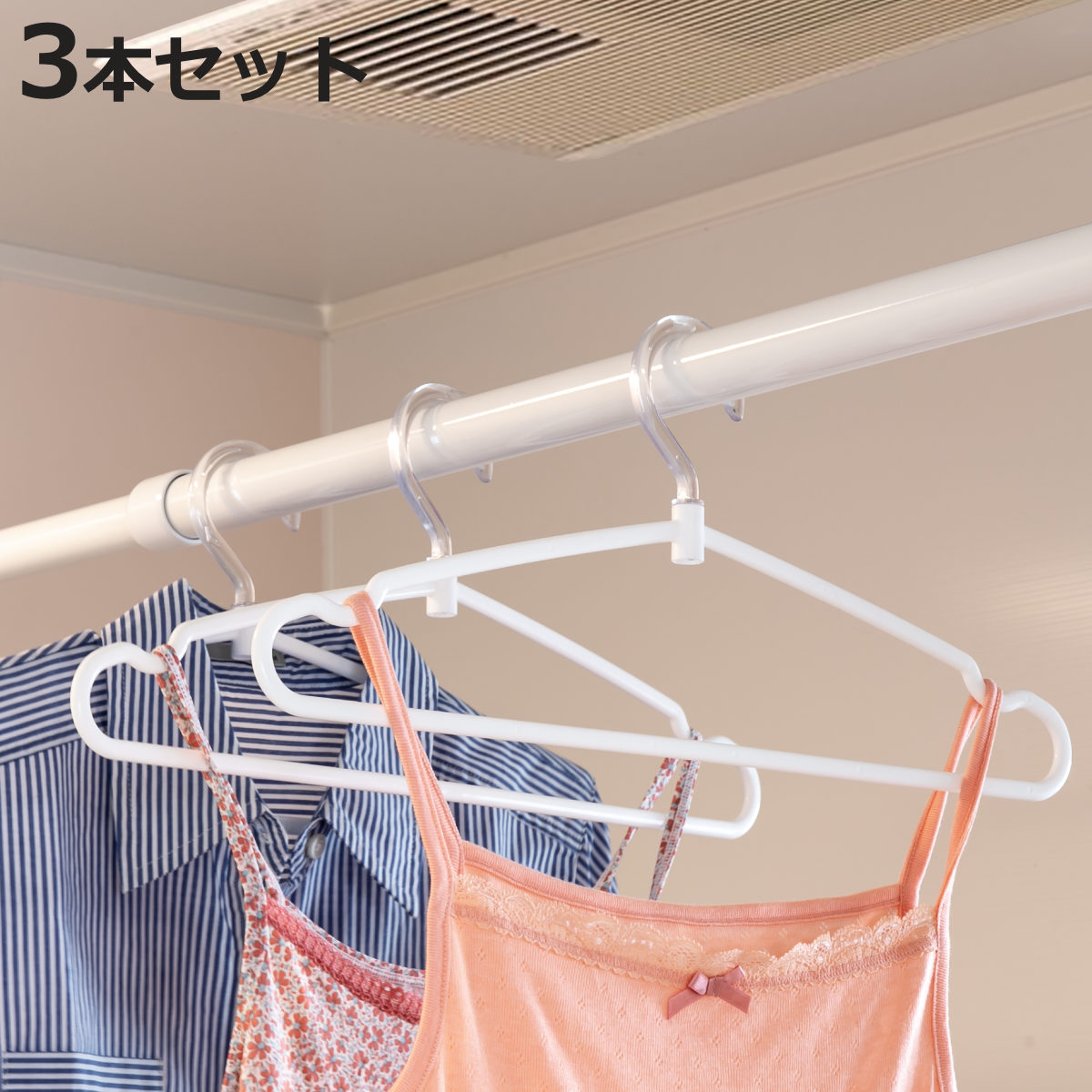 | ひも掛け付き キャミソールなどの肩ひもや、スカートのひもが掛けられます。男性、女性どちらの衣類でも掛けられる肩幅41cmのワイドタイプです。 | 45度ずつ回るフック 斜め干しが出来て、狭いスペースでも壁などに当たらないように干すことが出来ます。※45度ずつ止まるためクルクルは回りません。 |
