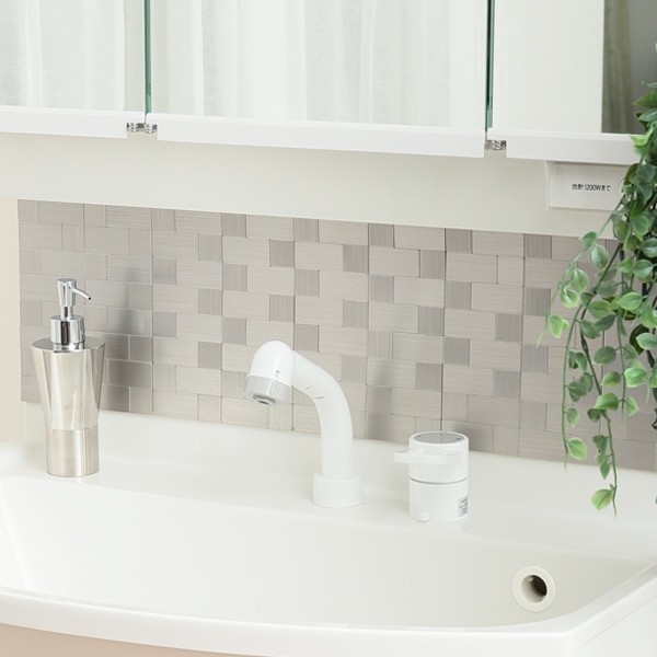 | シールタイプ 裏の剥離紙を剥がして張るだけのシールタイプなので簡単に設置できます。(※強粘着のため、貼り直しはできません。) | フリーカットOK 目地に沿ってハサミでカットできます。(目地以外をカットする場合は市販のタイルカッターをお使いください。) |