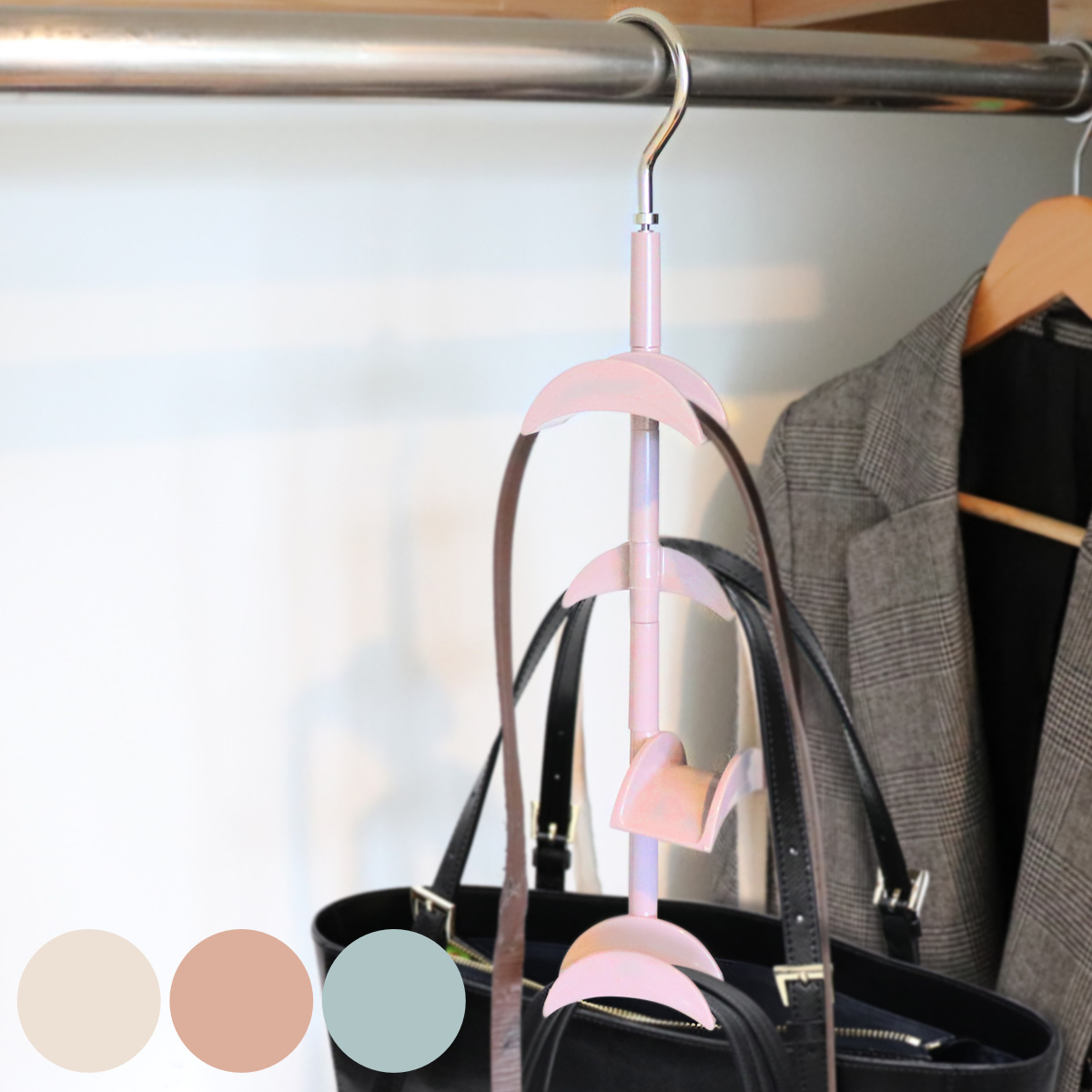 お気に入りのバッグを引っ掛けてキレイに収納かさばるバッグを引っ掛けて収納できるハンガーです。バッグの変形を防ぎながら、省スペースに収納できます。クローゼットやハンガーラックなど、今ある収納スペースに手軽に取り入れられるアイテムとして便利です。