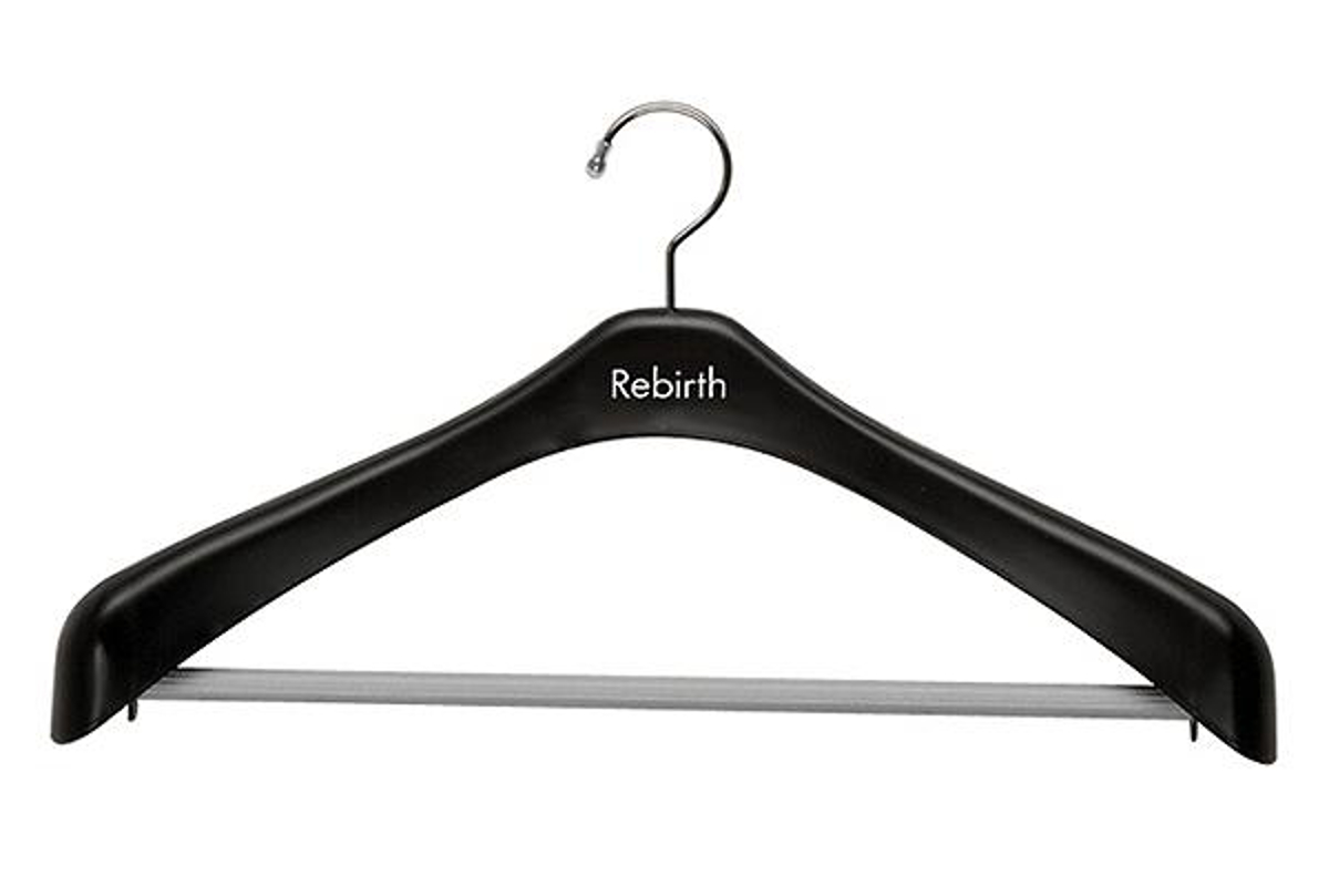 環境に優しい素材のジャケットハンガー再生プラスチックを使った環境に優しい素材のジャケットハンガーです。スラックスを掛けられるバーが付いているので、ジャケットやスーツなどを収納するのにお勧めです。