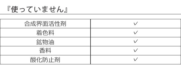 | 備考 | ※合成界面活性剤、着色料、鉱物油、香料、酸化防止剤不使用 ※お肌に合わないときはご使用をおやめください ※本品は無香料・無着色です ※色や香りに天然成分に由来するバラつきが生じることがありますが品質には問題ございません |
