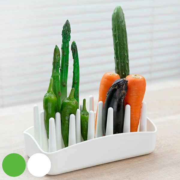 野菜を立てた状態で保存できる野菜スタンドです。野菜は収穫前の形で保存することで、鮮度を保持できると言われています。また、野菜を立てることで冷蔵庫や野菜室がスッキリ片付き、どんな野菜があるか鮮度などもすぐに分かります。