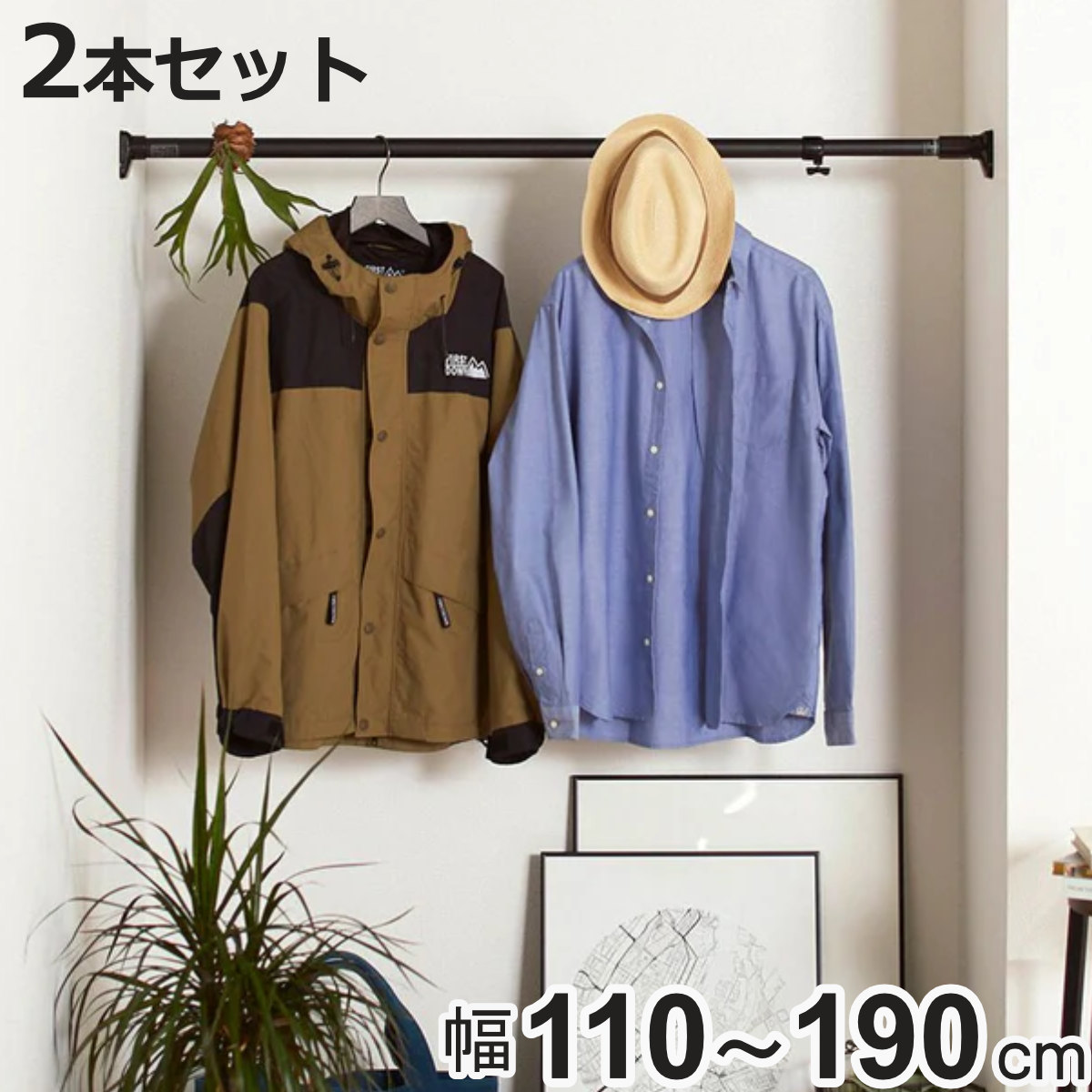 マットブラックがおしゃれな突っ張り棒 110〜190cm 2本セット幅広いテイストのインテリアに馴染む突っ張り棒です。クローゼット、キッチン、ランドリーなどのデットスペースを利用して収納力をアップできます。壁に穴をあけないので、賃貸住宅でも手軽に収納スペースを増やせます。