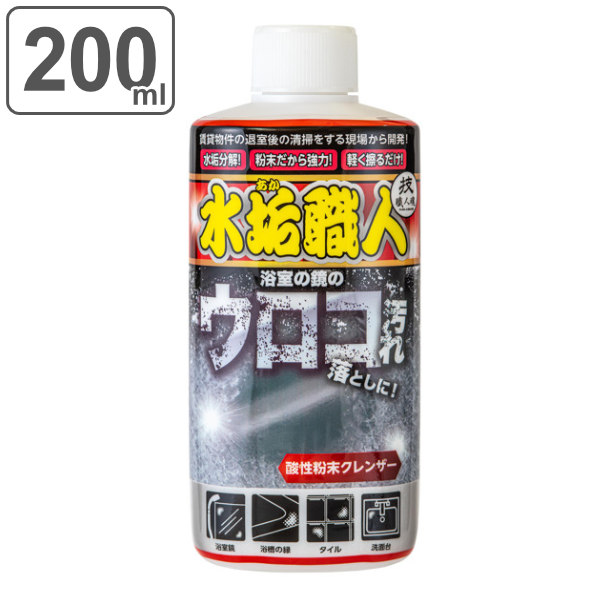 水まわりのお困りの汚れを解決水垢職人は、酸性の粉末と研磨剤を両方粉体で配合することにより水に濡れると酸性液体になり研磨剤も溶けずに使える強力な洗浄剤です。
