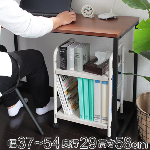 | 足の邪魔になりにくい 脚部は足元の邪魔にならないように、床から下段の棚までの隙間を高めに設計されています。机下の限られたスペースでも、足元を広々とお使い頂けます。 | ロック付きキャスター キャスターが付いているので、移動や掃除の際にも収納物を乗せたまま楽に動かすことができます。また、ロックが付いているため、デスク下で動く心配もありません。 |