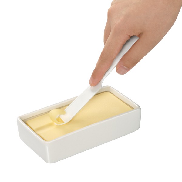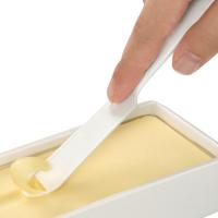 固いバターも薄く削れてパンにスッとぬれる先端にピーラーがついているプラスチック製のバターナイフです。冷蔵庫から出したばかりの固いバターも押し当ててスーッと引くだけで削れます。