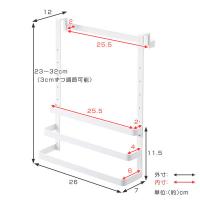 | サイズ | 約 幅26×奥行12×高さ23(cm) 外寸 高さ:約23〜32cm(3cmずつ調節可能) ゴミ袋ホルダーのみ:約 幅26×奥行7×高さ11.5(cm) 内寸 タオルハンガー:約 幅25.5×奥行2(cm) ゴミ袋ホルダー長:約 幅25.5×奥行6(cm) ゴミ袋ホルダー中:約 幅25.5×奥行4(cm) ゴミ袋ホルダー短:約 幅25.5×奥行2(cm) |