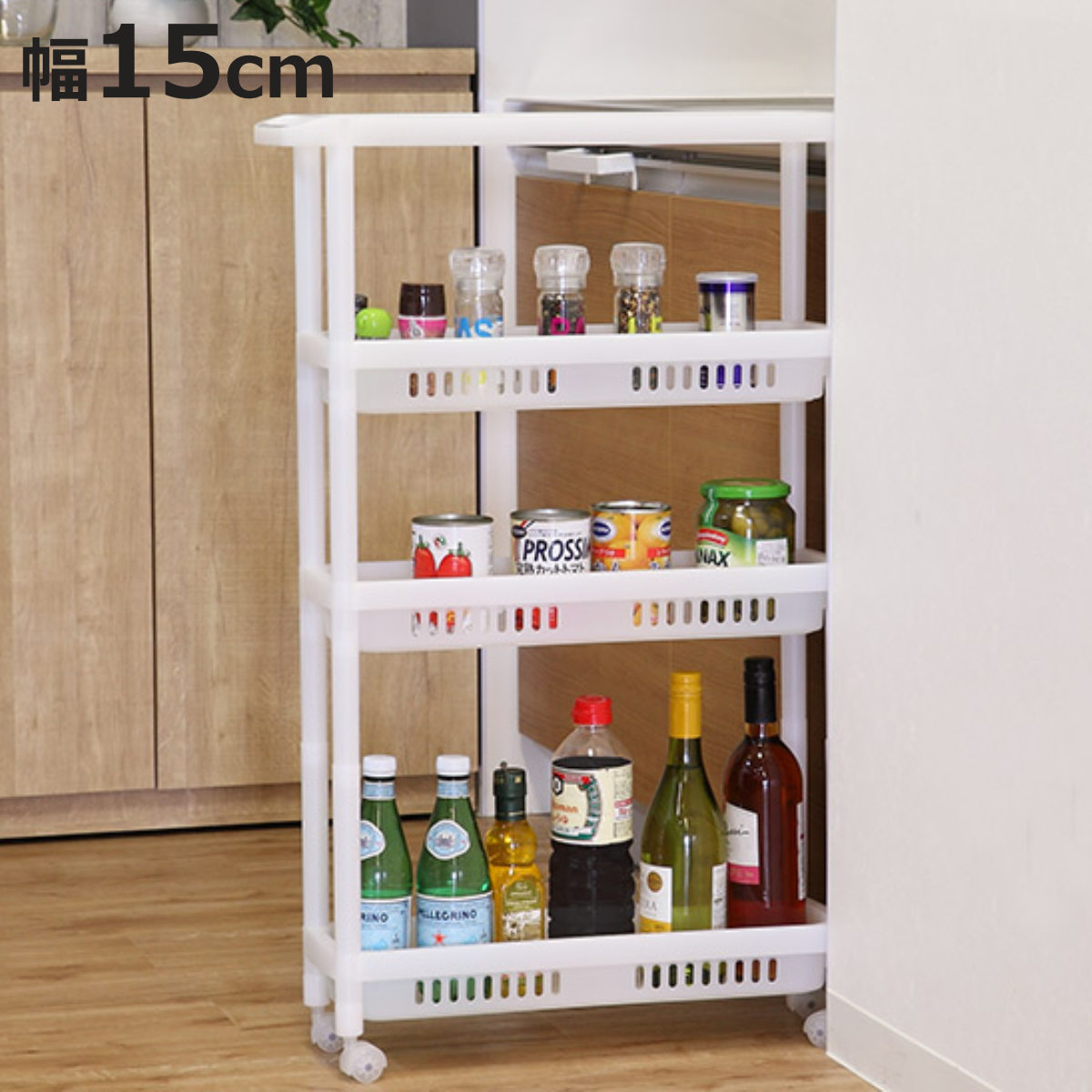 ●幅15cmのデッドスペースを有効活用できるスリムキッチンワゴンです。