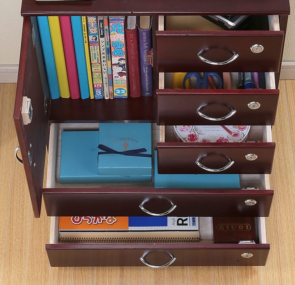 大容量の収納スペース扉内と、大小5段の引出しがあり、全てに鍵がかけられるので、大切な物を安心して収納できます。