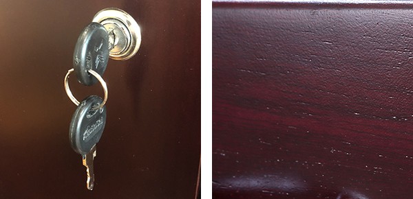 付属の鍵 扉部分と引出し全段に共通の鍵が2個付いています。