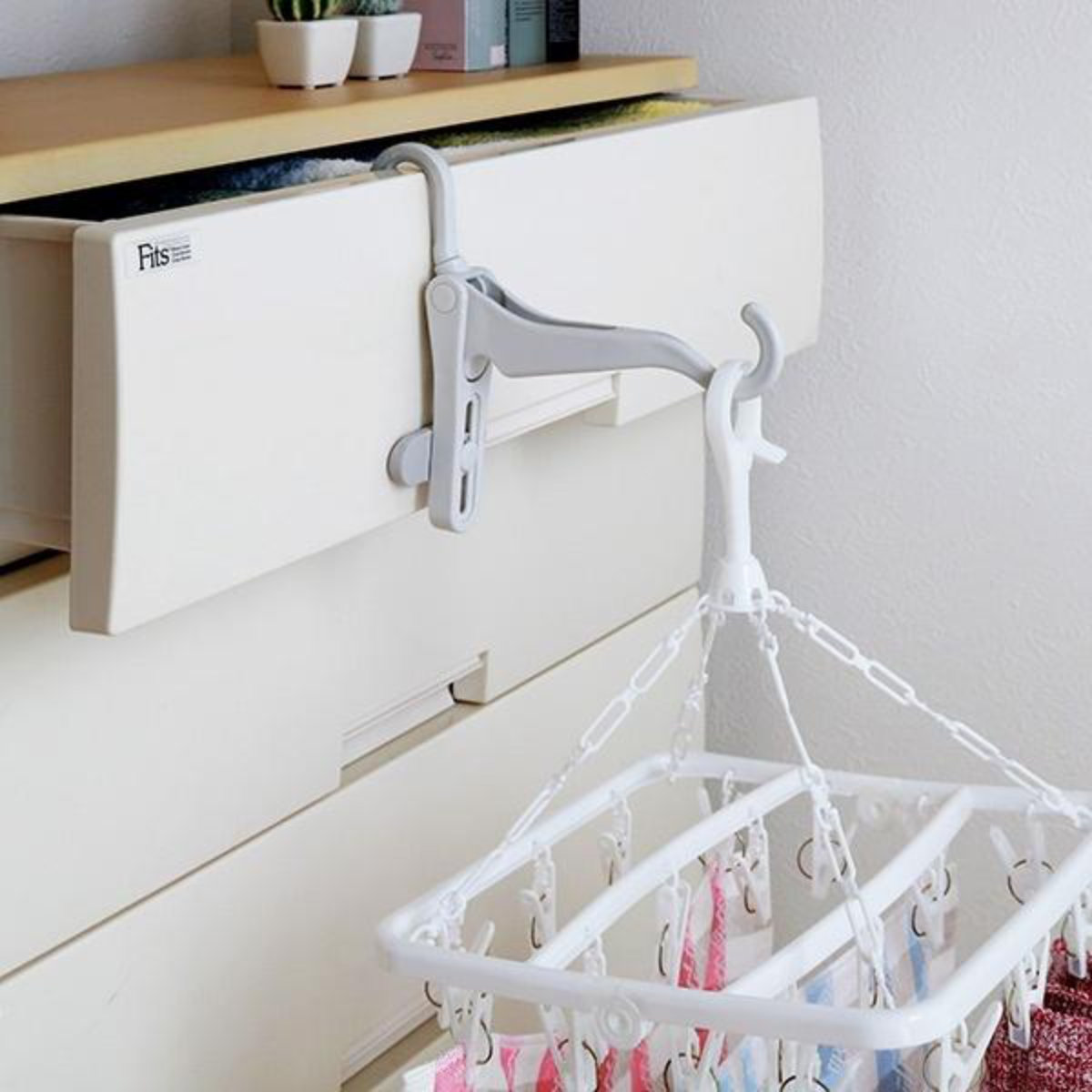 可動式の背面プレートがついており、引き出しの高さに合わせてプレートの位置を4段階に調節できます。このため、いろいろな場所に掛けられ、安定して干すことができます。フック部は360度回転します。