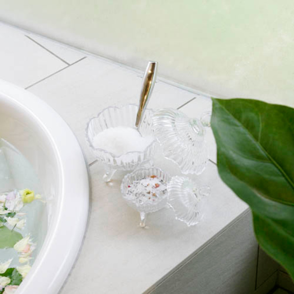 空間をおしゃれに優雅に演出する脚付きのコロンとしたフォルムが美しく愛らしい、ガラス製のコットンポットです。まるでお姫様のドレッサーに置いてありそうな、上品で可愛らしいデザインのコットンポットが、洗面所空間を優雅に彩ってくれます。