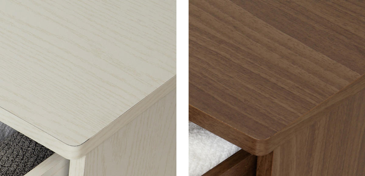 | 明るく清潔感のあるホワイトオーク柄 うっすらと木目模様が見えるホワイトカラー。ガーリーやモノトーン、ナチュラルなお部屋に合わせやすいです。 | 落ち着きのあるウォールナット柄 世界3大銘木の1つであるウォールナットのような美しい色合いで、お部屋を落ち着いた空間に。 |