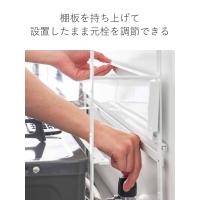 下段の棚板が上に開くので、設置したままガスの元栓の開閉ができます。ガスホースを通せる穴付きで、ガス栓が絡まらずにキッチンにぴったり設置できます。コンロ奥がすっきりと整頓できるので、見映えもよく気持ちよく料理できます。
