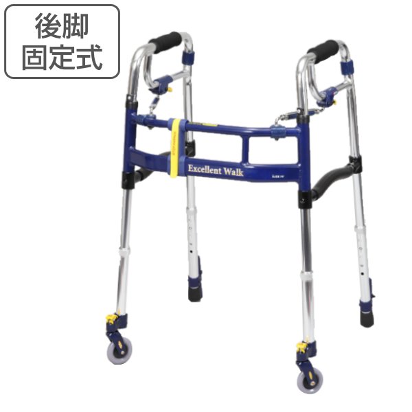 | グリップ角度調節 手元のグリップを使用者が握りやすい角度に調整することができます。ターンバックルを回すとコの字型やハの字型、又は左右別々に角度の調整をすることができます。 | 脚部固定リング 脚部のぐらつきを減少させるための固定リングが付いています。 |