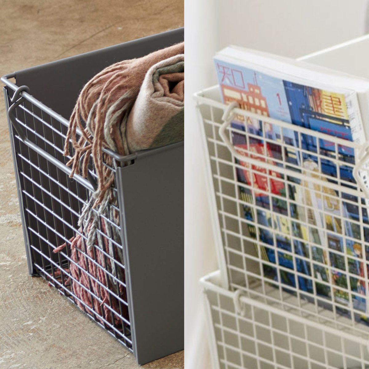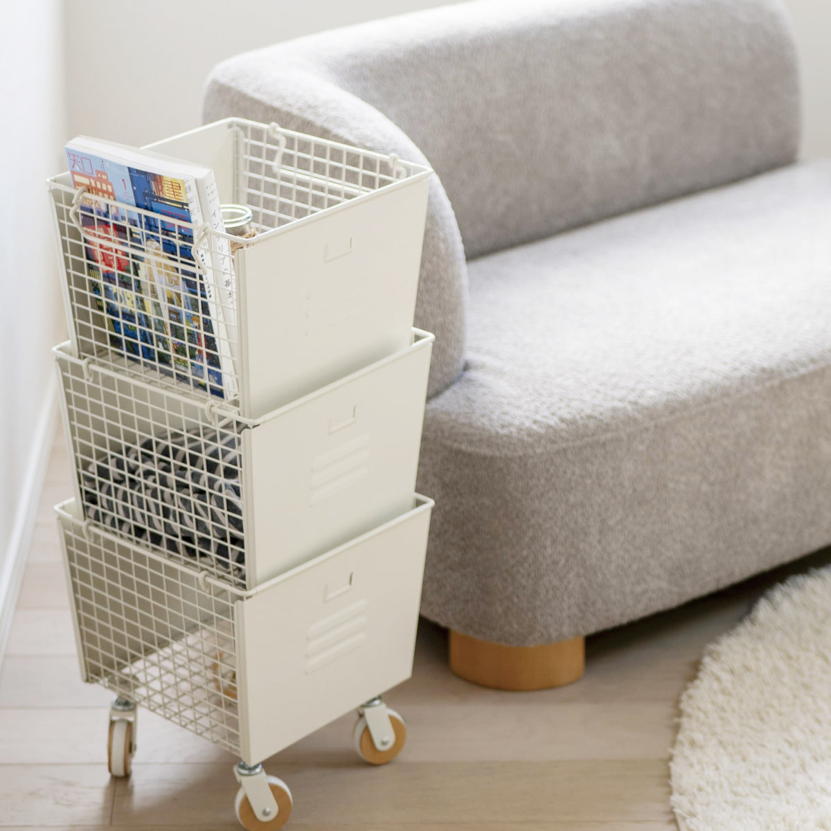 ソファーサイドに置きたくなるサイズ感で、リモコンや雑誌に加え、本やブランケットまでまとめて置けます。