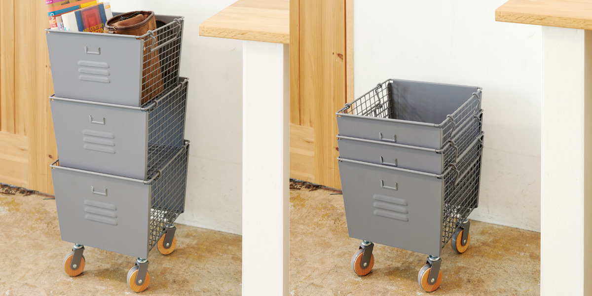 無骨で男前なスチールロッカー風デザインの収納ボックです。重ねて使えるので、省スペースながら収納力を発揮します。
