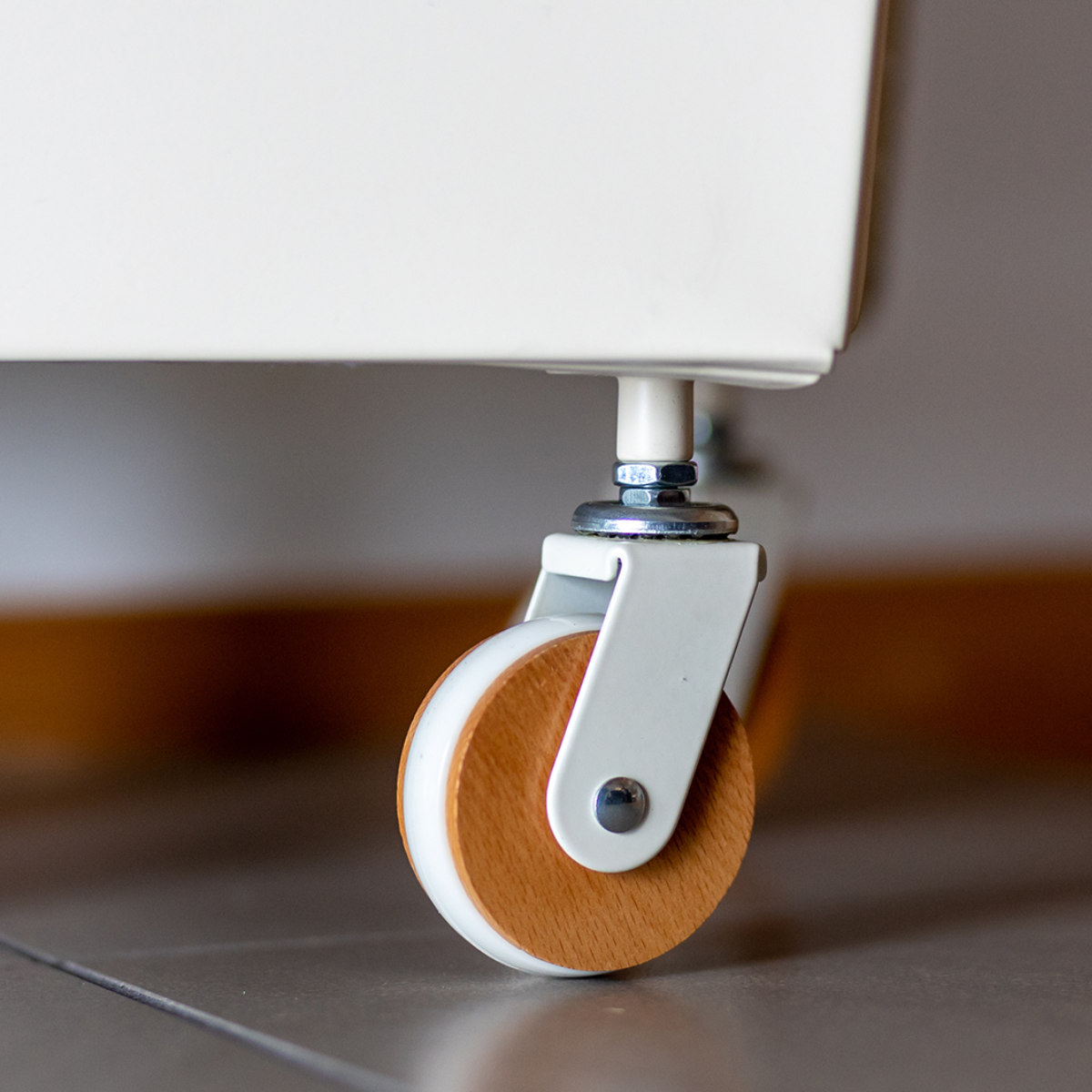 下段のボックスには、天然木をあしらった4輪キャスター付き。スチールとの組み合わせで見た目もおしゃれ。お好きな場所に気軽に移動してお使いいただけます。