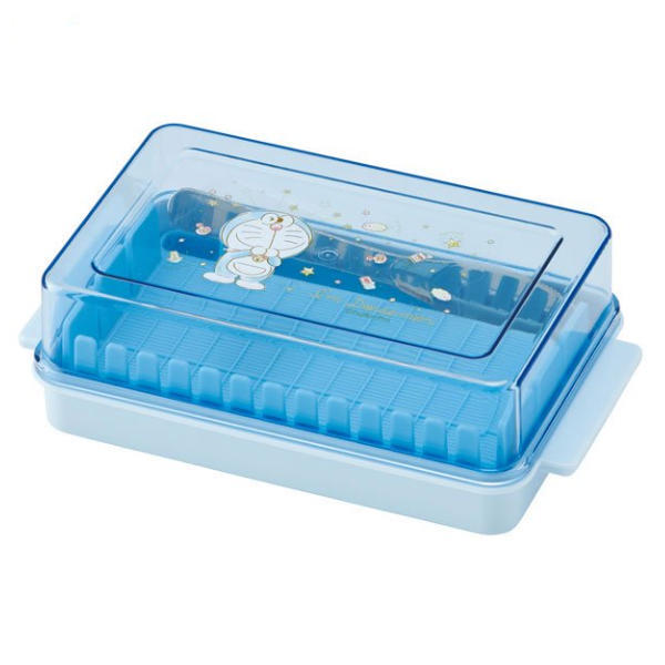 計量せずにバター適量を手早くきれいに切れるバターケースドラえもん柄のカッティングガイド付きバターケースです。5g、10g、15gと必要な量を自由にカットできます。計量せずにバター適量を手早く切れるから、お子さんでも簡単に必要な量のバターを切り取れます。切り分けたバターを取り出しやすいステンレス製の先割れナイフ付きです。