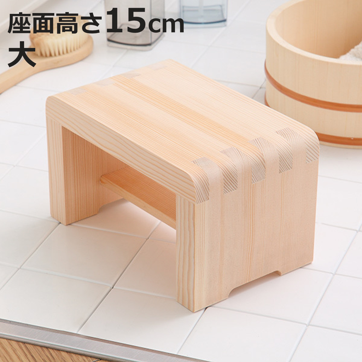 | 重心が安定する四つ脚加工 脚にはくぼみ加工が施されている為、脚の裏全体が床につかず水に触れる面積を減らすことで重心を安定させてくれます。 | 「ホゾ組構造」で衛生的 釘やネジを使用しない「ホゾ組構造」で、錆びが出る心配もないので、衛生的にお使いいただけます。 |