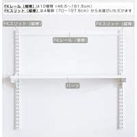 FKスリット(縦棒)の両方を壁に設置して、棚などのパーツを取り付けます。取り付けスペースに合わせて、FKレールは横幅【46.5〜181.5cm】の10種類・FKスリットは高さ【70〜198cm】の4種類から選べるため、無駄なスペースなく設置できます。FKスリット(縦棒)は、2.5cm間隔の穴に自由自在にパーツを取り付け可能です。