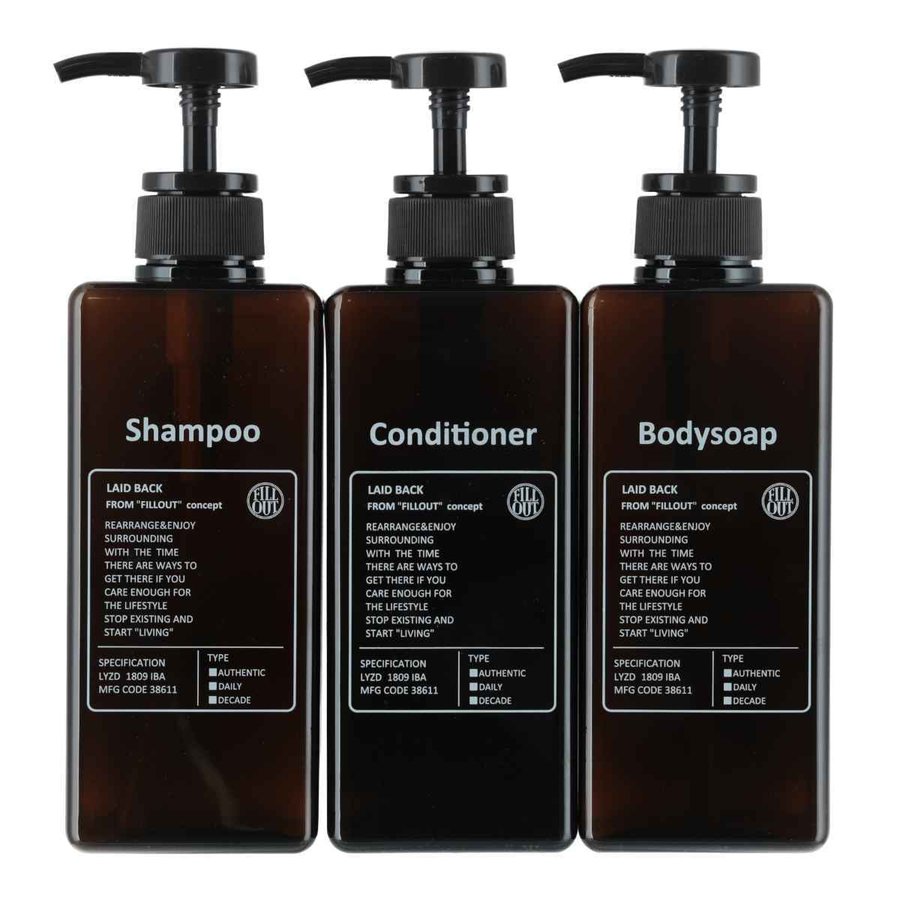 琥珀色で透明感のあるシンプルなデザインの各容量約650mlのボトルです。同シリーズのシャンプー、コンディショナー、ボディソープを揃えることで統一感が出ます。