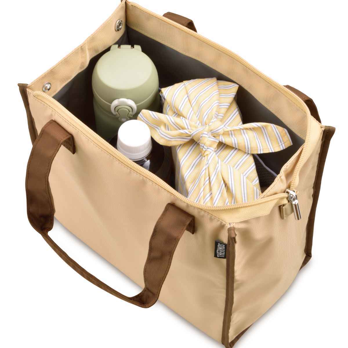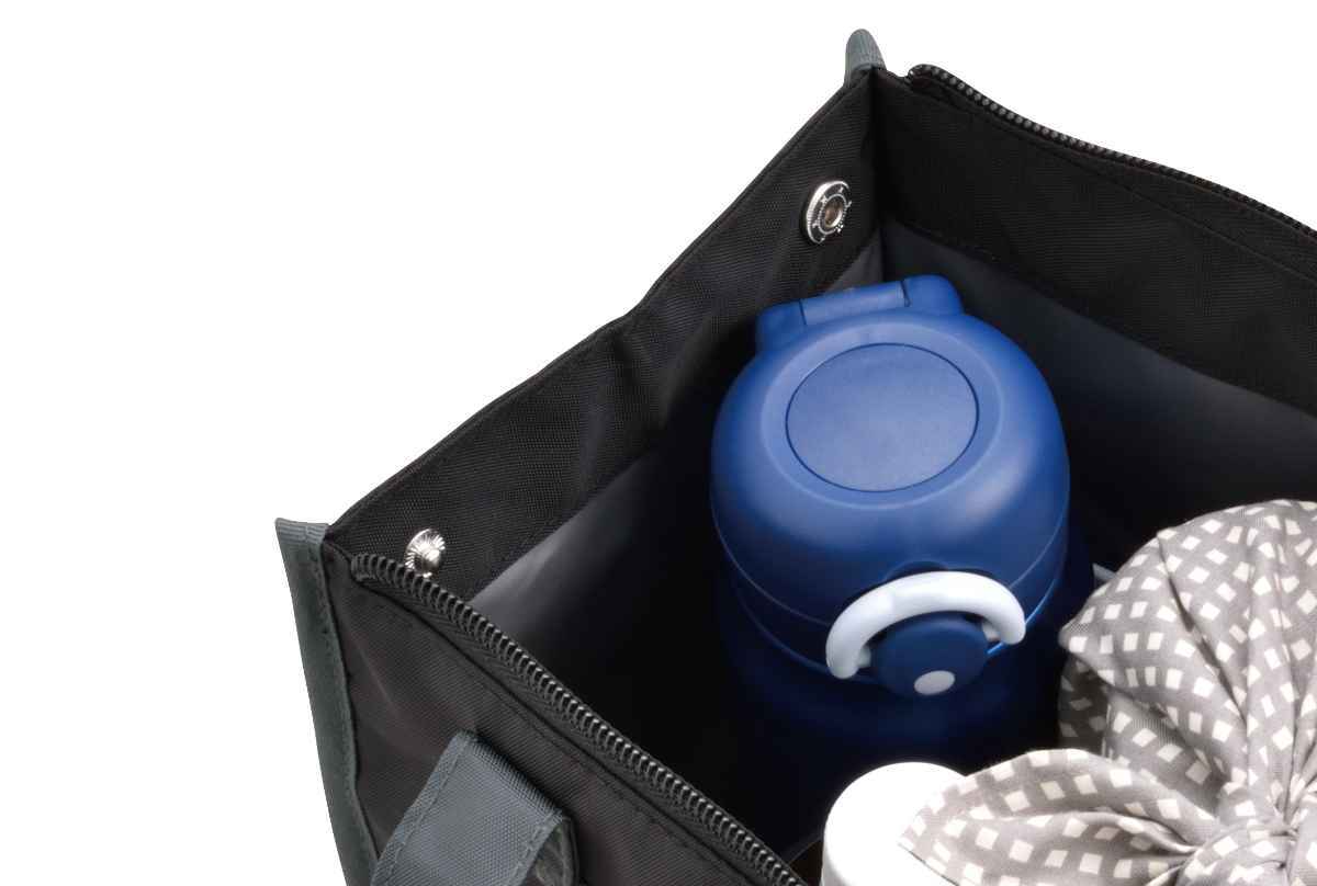 ボックス型なので口元が大きく開くマチが15cmのボックス型なので口が大きく開き、ランチグッズの出し入れが簡単です。また、内側には小物入れに便利なメッシュポケット付きです。開閉口はファスナータイプなのでしっかりバッグの口を閉じることができ、持ち運びの際も安心です。