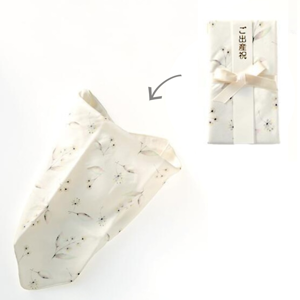 バンダナタイプのスタイに変身一見かわいい柄のご祝儀袋ですが、バンダナタイプのスタイに変身します。「ママ・パパがもらってうれしい」をコンセプトに、ちょっぴり大人でシンプルなデザインです。