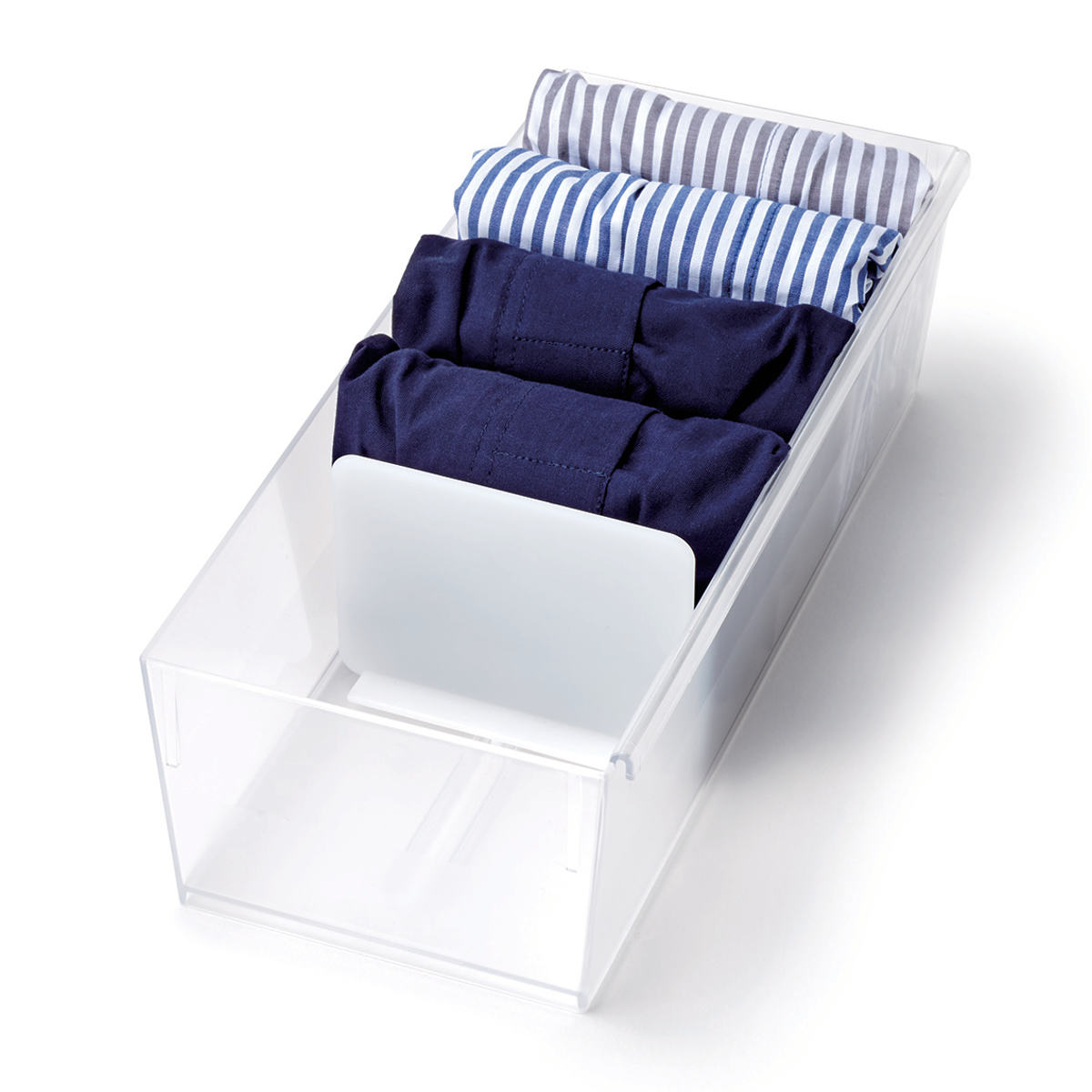 中身が見えるクリアタイプの仕切りケース●散らかりがちな衣類小物を、小分けて収納できる仕切りケースです。