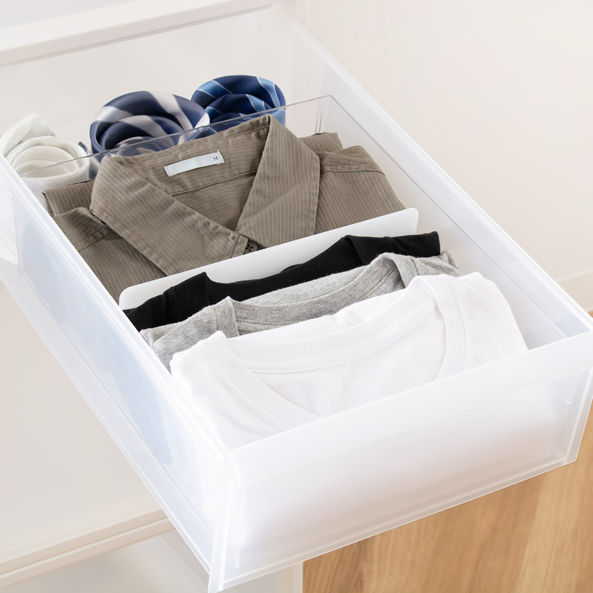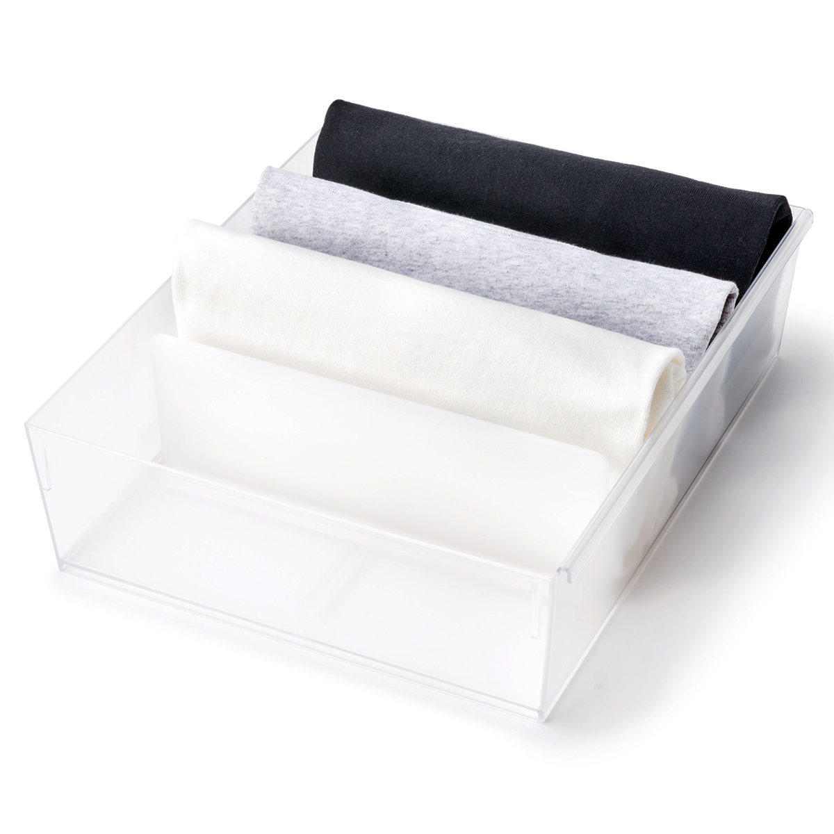 中身が見えるクリアタイプの仕切りケース●散らかりがちな衣類小物を、小分けて収納できる仕切りケースです。