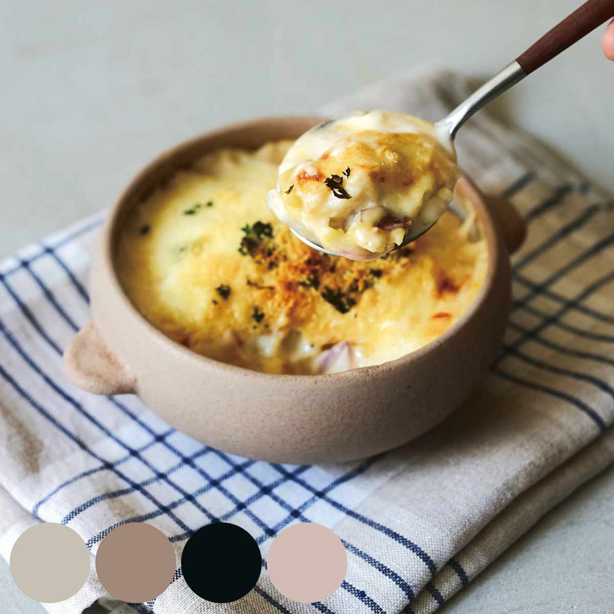 熱々のオーブン料理をそのまま食卓へ オーブンボウル 11cmころんとしたフォルムが可愛いオーブンボウルです。グラタンやパイシチューなどのオーブン料理にはもちろん、具沢山のスープやポトフにもちょうどいい大きさです。朝食のグラノーラやランチのサラダなど様々なシーンでお使いいただけます。