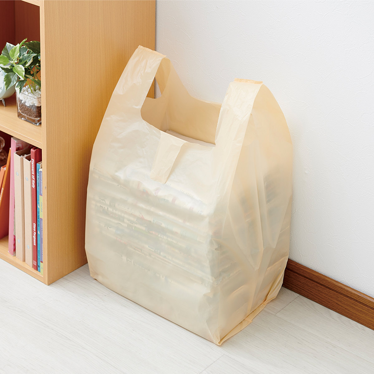 手軽で便利な新聞紙回収袋バイオマス素材を使用した、新聞雑誌回収袋です。ため込んでかさばりがちな不要な新聞や読まなくなった雑誌を入れるだけで分別、収納ができます。新聞紙約1ヵ月分がスッポリ入り、ヒモで縛る手間もありません。